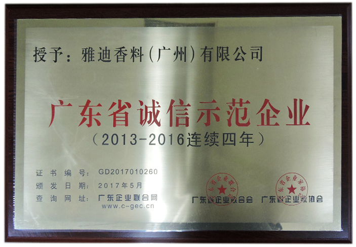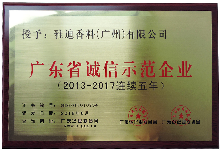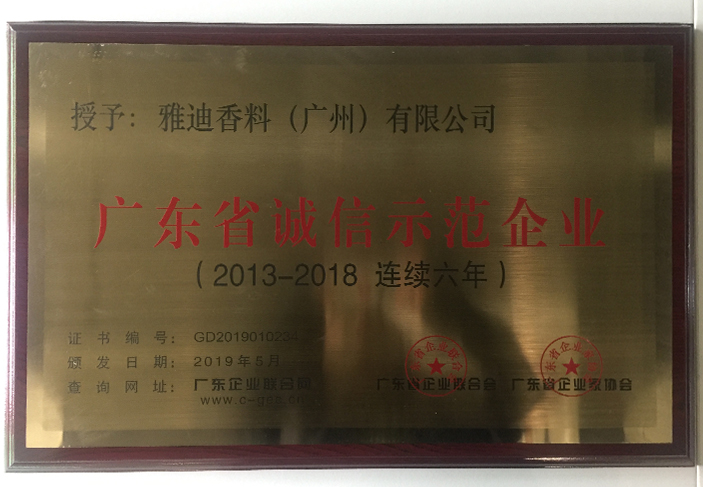 雅迪香料(广州)有限公司获得2013-2018连续六年广东省诚信示范企业荣誉称号,由广东省企业联合会、广东省企业家协会颁发。