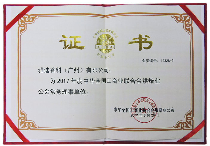 雅迪香料(广州)有限公司为2017年度中华全国工商业联合会烘焙公会常务理事单位。