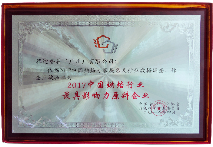 依据2017中国烘焙专家提名及行业数据调查,雅迪香料(广州)有限公司被推举为2017中国烘焙行业最具影响力原料企业。
