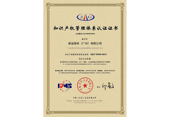 雅迪香料(广州)有限公司通过认证知识产权管理体系符合标准:GB/T 29490-2013并获得认证证书。