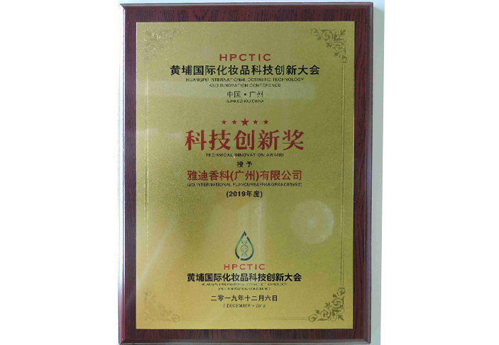黄埔国际化妆品科技创新大会授予雅迪香料(广州)有限公司“科技创新奖”。
