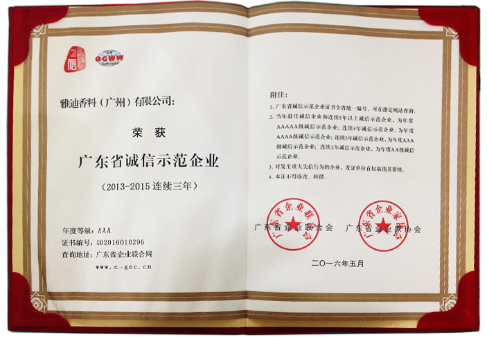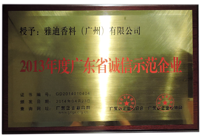 雅迪香料(广州)有限公司连续三年荣获“广东省诚信示范企业”荣誉称号,为年度AAA级诚信示范企业,由广东省企业联合会和广东省企业家协会颁发。