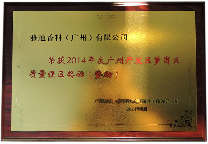 雅迪香料(广州)有限公司荣获由广州开发区萝岗区质量强区工作领导小组颁发的“2014年度广州开发区萝岗区质量强区奖励(资质)”。