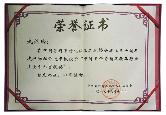 雅迪香料总经理武燕玲女士在中国香料香精化妆品工业协会成立三十周年庆典活动评选中被授予“中国香料香精化妆品行业杰出个人贡献奖”。
