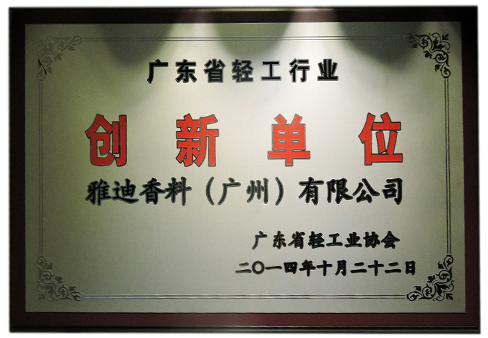 雅迪香料(广州)有限公司荣获由广东省轻工业协会颁发的“广东省轻工行业创新单位”荣誉称号。