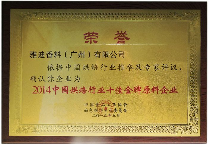依据中国烘焙行业推举及专家评议,确认雅迪香料(广州)有限公司为“2014中国烘焙行业十佳金牌原料企业”,由中国食品工业协会面包糕饼专业委员会颁发荣誉牌匾。