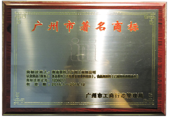 雅迪香料注册为广州市著名商标。