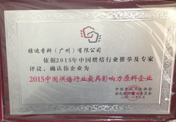 依据2015年中国烘焙行业推举及专家评议,确认雅迪香料(广州)有限公司为“2015中国烘焙行业最具影响力原料企业”,由中国食品工业协会面包糕饼专业委员会颁发荣誉牌匾。