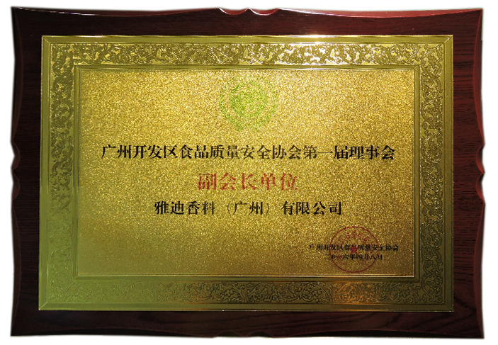 雅迪香料(广州)有限公司担任广州开发区食品质量安全协会第一届理事会副会长单位。