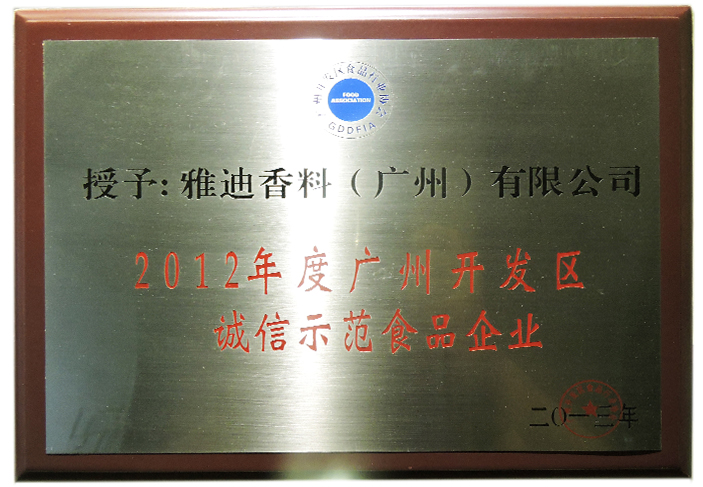 广州开发区食品行业协会授予雅迪香料(广州)有限公司“2012年度广州开发区诚信示范食品企业”荣誉称号。