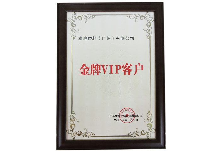 由广东质检中诚认证有限公司认证雅迪香料(广州)有限公司为“金牌VIP客户”。